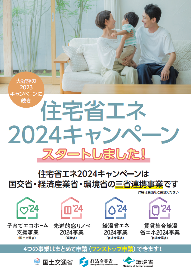 昨年に引き続き2024年も住宅省エネキャンペーンが実施されます。お陰様で当社も昨年たくさんのお客様の補助申請をさせていただきました。このキャンペーンは2050年カーボンニュートラルの実現に向け、家庭部門の省エネを強力に推進するため住宅の断熱性の向上や高効率給湯器の導入等の住宅省エネ化を支援されます。今年も盛り上がる事間違いないでしょう。